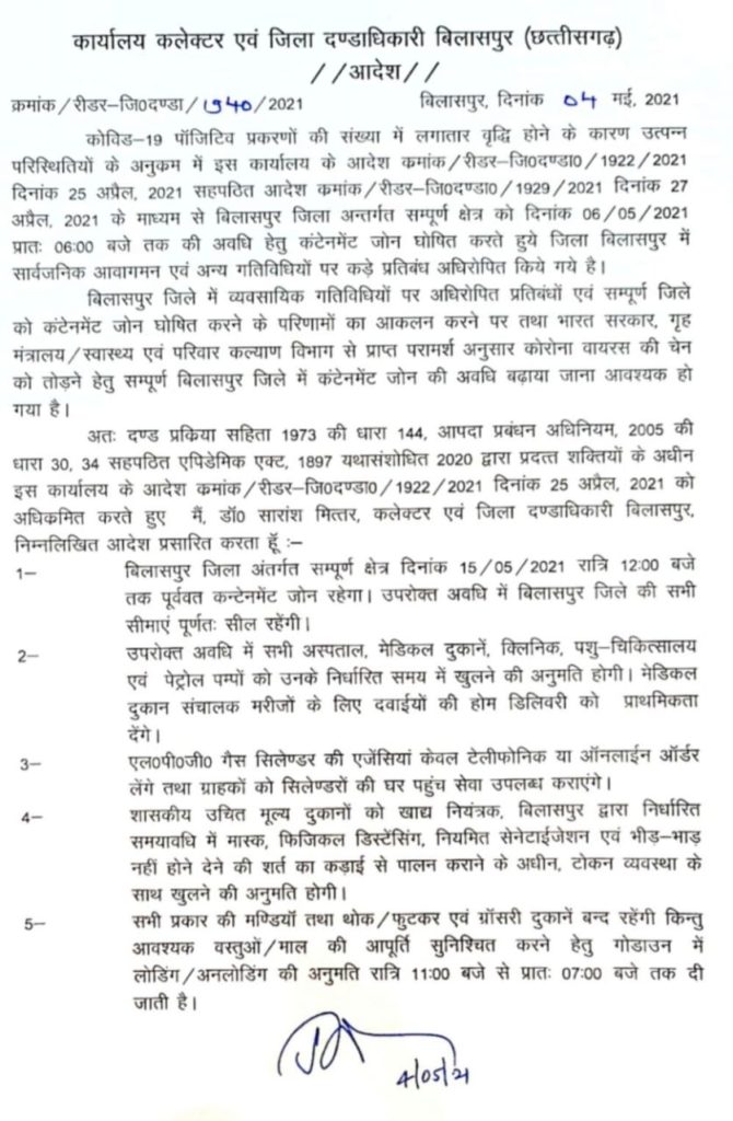 बिलासपुर पिछले 14 अप्रैल से जिले में जारी लाक डाउन अब 15 मई तक जारी रहेगा ।कोरोना संक्रमण के बढ़ते मामले को देखते हुए राज्य शासन के निर्देश पर बिलासपुर कलेक्टर सारांश मित्तर ने लाक डाउन की अवधि को 15 मई की रात 12 बजे तक बढ़ाए जाने का आदेश जारी कर दिया है