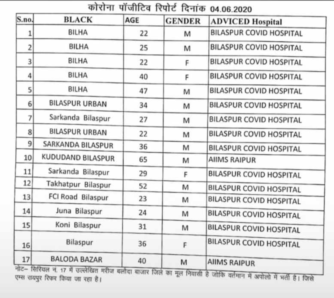 जिसमें 5 बिल्हा, बिलासपुर अर्बन 2, सरकंडा 3, कुदुदंड 1, तखतपुर 1 एफसीआई रोड 1,जूना बिलासपुर 1 कोनी 1, सहित अन्य क्षेत्र से कुल 17 मरीज जिले से सामने आए है।